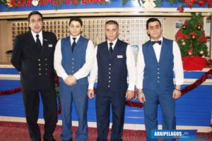 Πάμε στη ρεσεψιόν, τη βιτρίνα του πλοίου, όπου εκεί με ένα πελώριο χαμόγελο μας υποδέχεται ο Προϊστάμενος Αρχιθαλαμηπόλος κ. Αρτέμιος Δαμίγος ή κ. Μάκης και το team του. Πολλά συγχαρητήρια σε όλα τα παιδιά που κρατούν το πλοίο σε τόσο καλή και καθαρή κατάσταση!