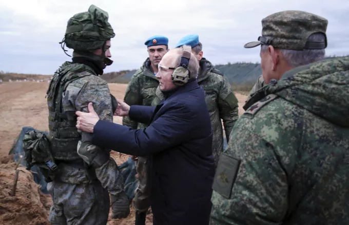 Πλάνα δείχνουν τον Ρώσο υπουργό Άμυνας να λέει στον Πούτιν πως οι ασκήσεις αφορούν την «απάντηση με ένα μαζικό πυραυλικό πλήγμα από τις στρατηγικές δυνάμεις επίθεσης σε απάντηση ενός εχθρικού πυρηνικού πλήγματος»