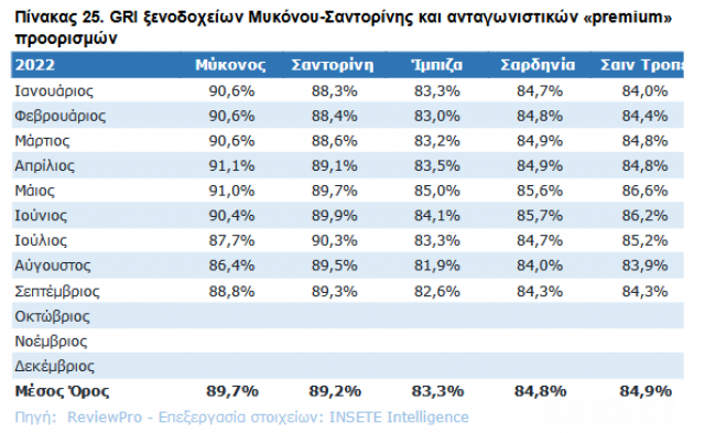 Μύκονος (88,8%), Σαιν Τροπέ (84,3%), Σαρδηνία (84,3%) και Ίμπιζα (82,6%).